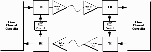 The FC-0 specifies a safety system - the Open Fibre Control system (OFC) - for SW laser data links, since the optical power levels exceed the limits defined by the laser safety standards. If an open fibre condition occurs in the link, the receiver of the Port the fibre is connected detects it and pulses its laser at a low duty cycle that meets the safety requirements. The receiver of the other port (at the other end of the fibre) detects this pulsing signal and also pulses it's transmitter at a low duty cycle. When the open fibre path is restored both ports receive the pulsing signals, and after a double handshaking procedure the connection is automatically restored within a few seconds [1].
