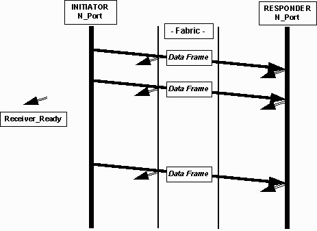 Class 1 is a service which provides dedicated connections, in effect providing the equivalent of a dedicated physical connection. Once established, a Class 1 connection is retained and guaranteed by the Fabric. This service guarantees the maximum bandwidth between two N_Ports, so this is the best for sustained, high throughput transactions. In Class 1, Frames are delivered to the destination Port in the same order as they are transmitted. Figure 5 shows the flow control management of a Class 1 connection.