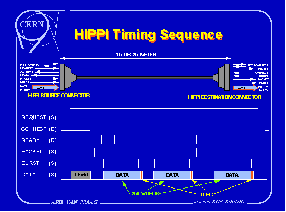 Fifty-pair, twisted-pair cables are used for distances up to 25 meters. The 800 Mbit/s option uses one cable, and the 1600 Mbit/s option uses two cables. All of the signal lines in the HIPPI are unidirectional to accommodate future, fibre-optic implementations and crossbar switches. All of the control and data signals are timed in relation to the constant 25 MHz CLOCK signal with a period of 40 nanoseconds.